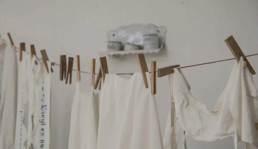 wash clothes in the cold water cycle and try to wait until you have a full load of like colors. NO BLEACH! choose a plant-based detergent free of fragrance, optical brighteners, chlorine, and phosphates because all of that stuff is bad for you and the environment. we like the following brands: Seventh Generation, Meyer’s, Method, or Earth Friendly Products. cool Iron if needed, don't tumble dry, hang or lay flat to dry.